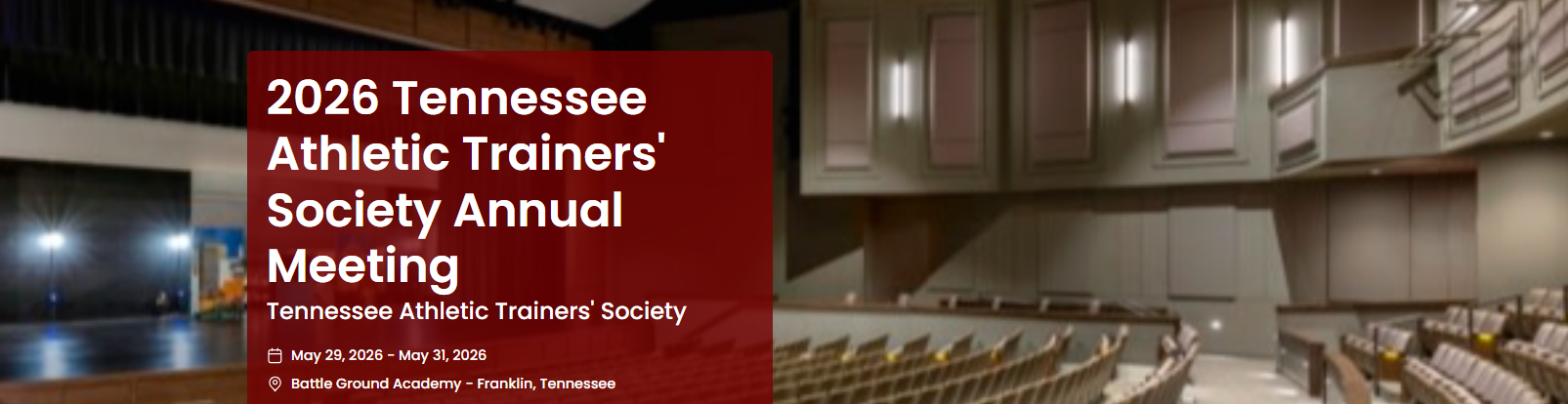 The Tennessee Athletic Trainers’ Society is excited to welcome you to Battle Ground Academy in Franklin, TN for the 2026 Annual Meeting and Symposium! Topics this year focus on nutrition, dermatology, heat illnesses, and emerging rehabilitation techniques for athletic trainers. Up to 14 CEUs may be obtained through main conference attendance.